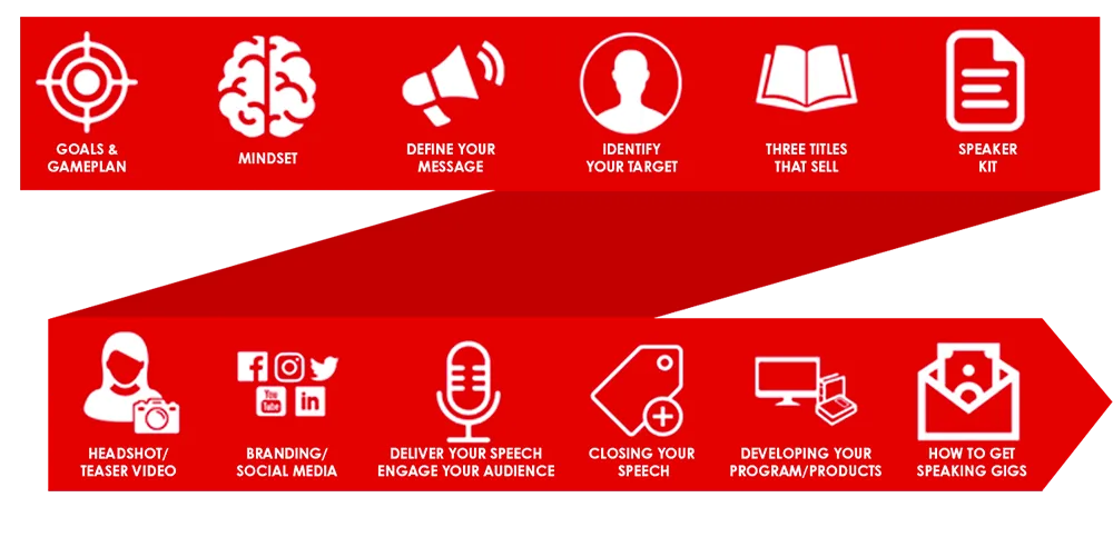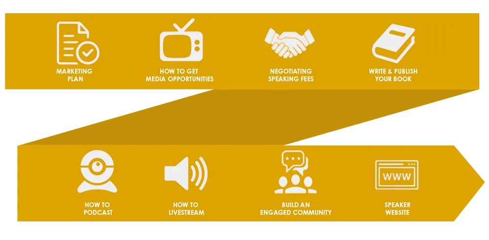 We offer two speaker pathways. The Emerging Speakers Pathway is targeted for those who are new to using speaking as a marketing strategy. The Professional Speakers pathway is for those who are seasoned speakers looking to enhance their skills. Overall each speaker pathway includes in-depth trainings that is equivalent to over 100 hours of on-demand videos. The video training archive includes videos for guidance on the following topics (click each graphic to enlarge):
